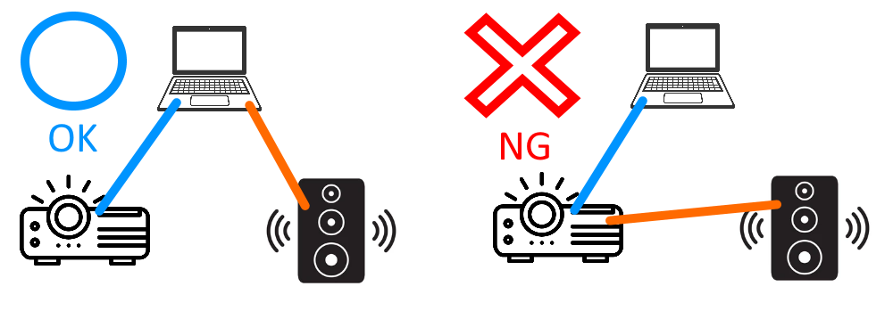 例えばイベントなどで前と後ろの壁面両方に投影したいような場合、別々の画像でしたらパソコン2台とプロジェクター2台を使用しますが、同じ画像を同じタイミングで投影する場合はパソコン1台で、分配器を使用して別々のプロジェクターに投影する方が効率的です。