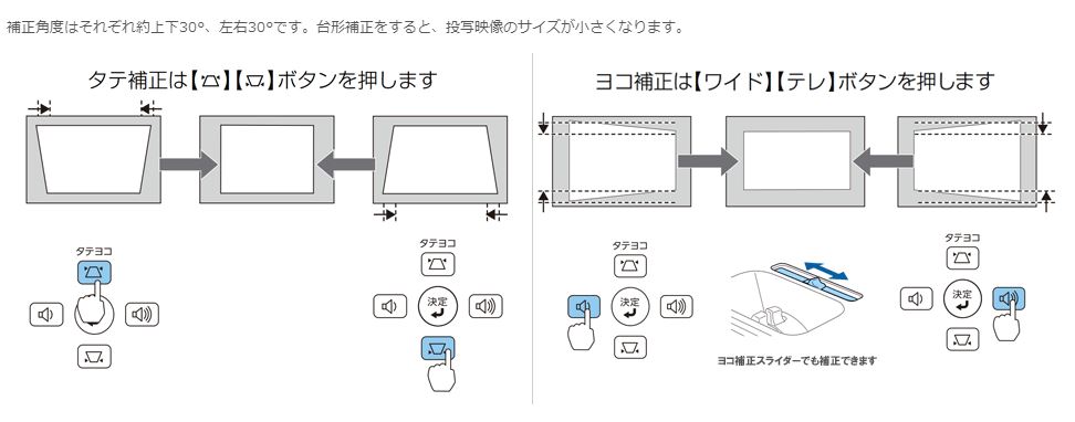 ただし投影される画面より小さくして補正するような仕組みになっているので、もちろん真正面から投影していただくのが一番性能を発揮できる使い方にはなりますが。